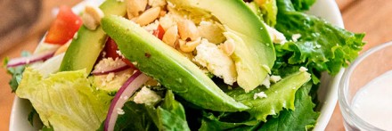 Lechuga, aguacate, cacahuates, jitomate cherry, calabaza, cebolla morada, aderezo.