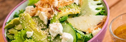 Lechuga, manzana verde, aguacate, ajonjolí caramelizado, pepino, cebolla frita, aderezo.