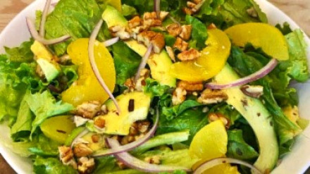 Lechuga, durazno, cebolla morada, aguacate, nuez, aderezo.